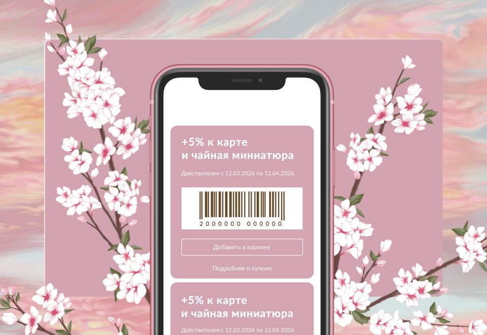 При обмене купона в период с 12 марта по 12 апреля 2026 года вас ждет дополнительная скидка +5% (суммируется со скидкой по карте) и приятный презент – чайная миниатюра в ассортименте.